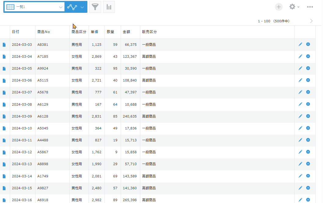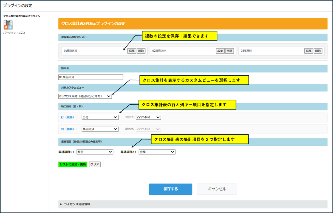 1つのプラグインの中で、複数の集計設定を保存できます。特定のカスタムビューに紐付けて動作するため、「商品区分別集計表」を開けば商品区分別の数量と売上高のクロス集計が、「年度別集計表」を開けば、年度別の売上数量と売上金額のクロス集計が自動的に動作します。