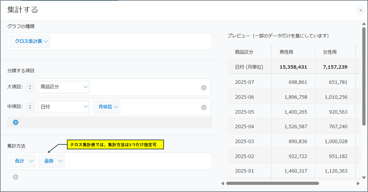 例えば、月別・商品区分別の2軸で売上数量と売上金額をクロス集計したい場合、2種類のクロス集計表を作成して切り替え表示する必要がありました。これでは、数量は出ているが単価が低いといった「売上の質」を直感的に把握することが困難です。