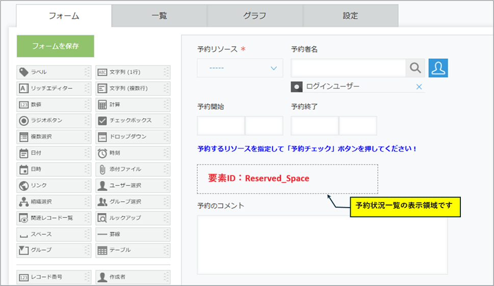 ・スペース:予約リスト表示用、要素IDが必要(例:Reserved_Space)