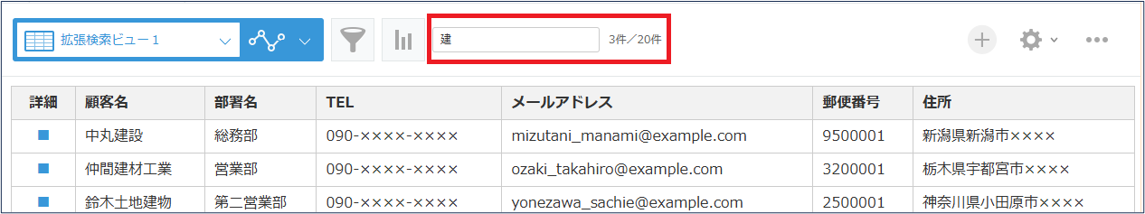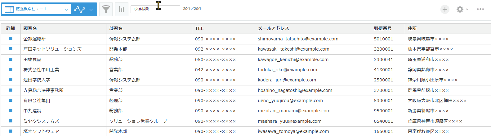 - レコード一覧を全角1文字や半角英数字の部分一致で検索できます。