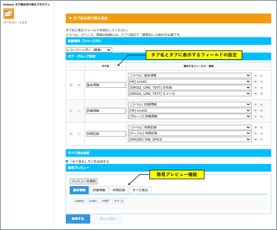 - レコード追加・編集・詳細画面で表示するフィールドをタブ表示で切り替えできます。
