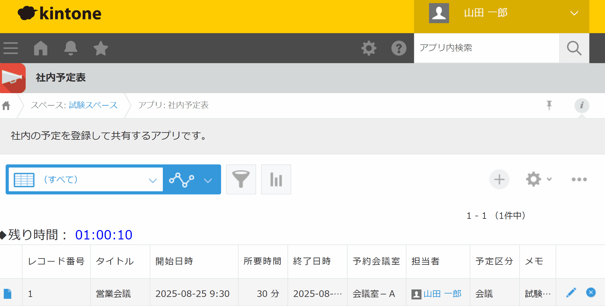kintoneアプリで作業中に、現在の時刻や、次の予定までの残り時間を手早くリアルタイムに把握できます。