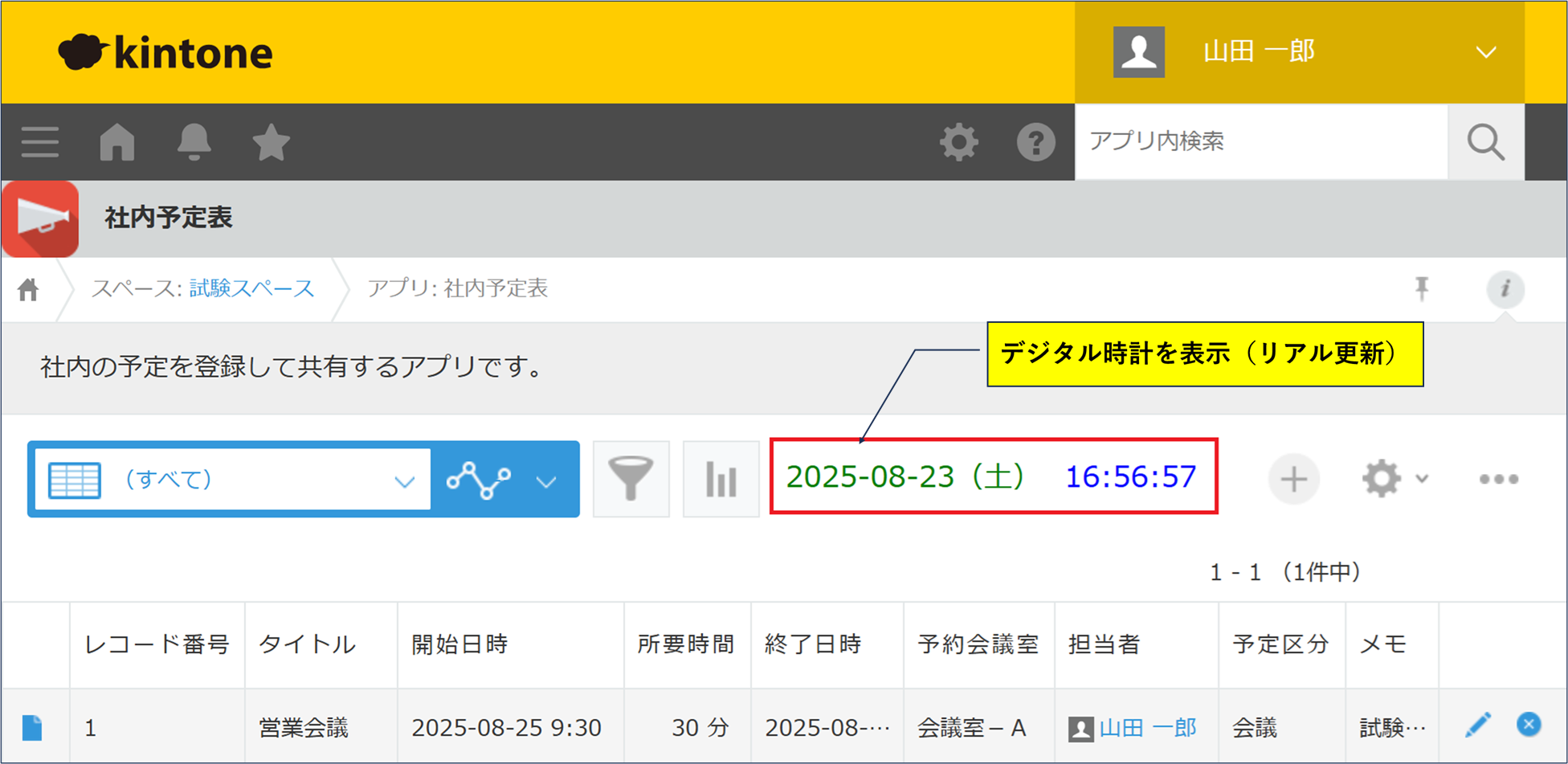 レコード一覧表のメニュー右横に、リアルタイム更新する日付と日時を表示します。