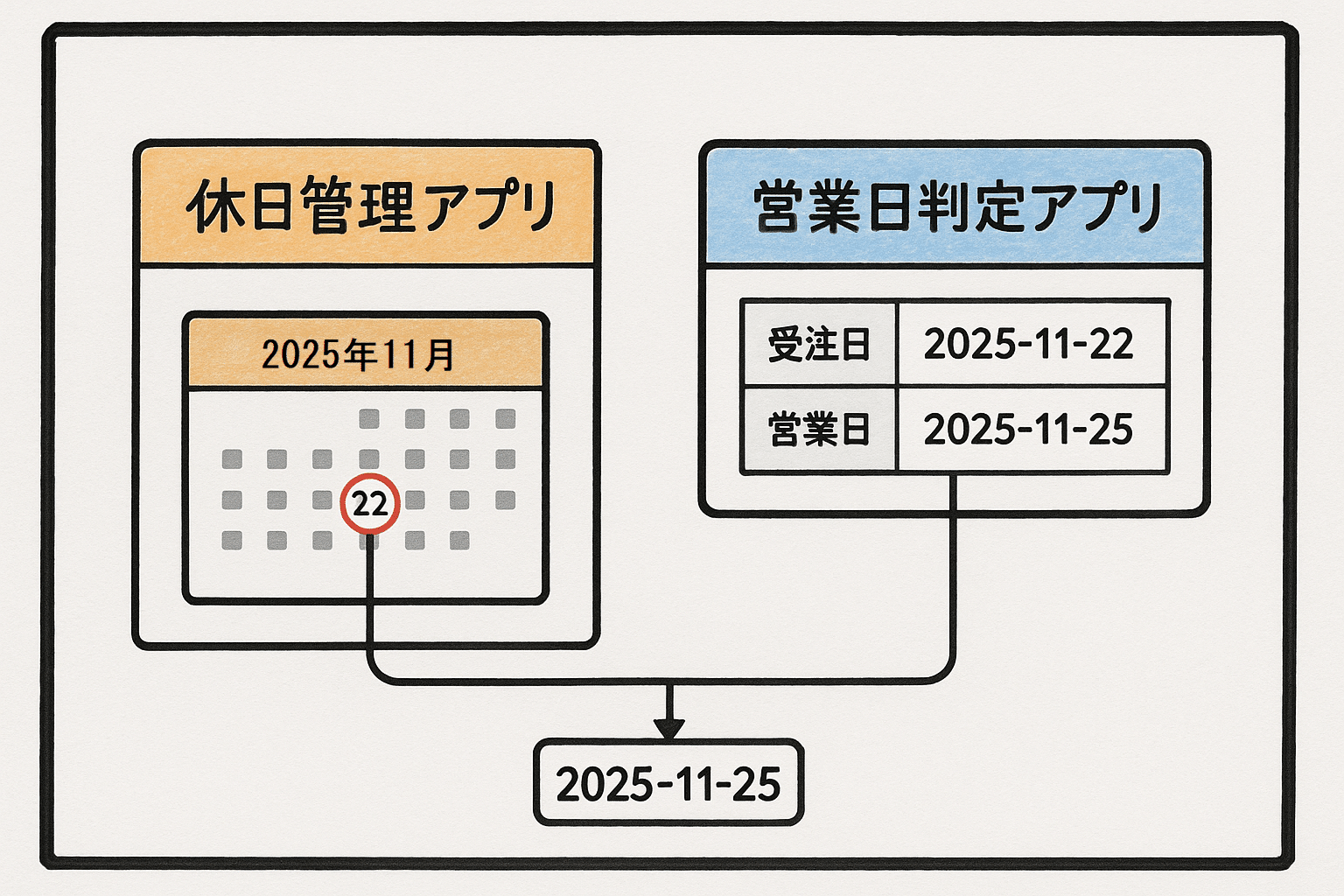 - 自社専用の休日カレンダー(休日管理アプリ)で営業日判定を行います。