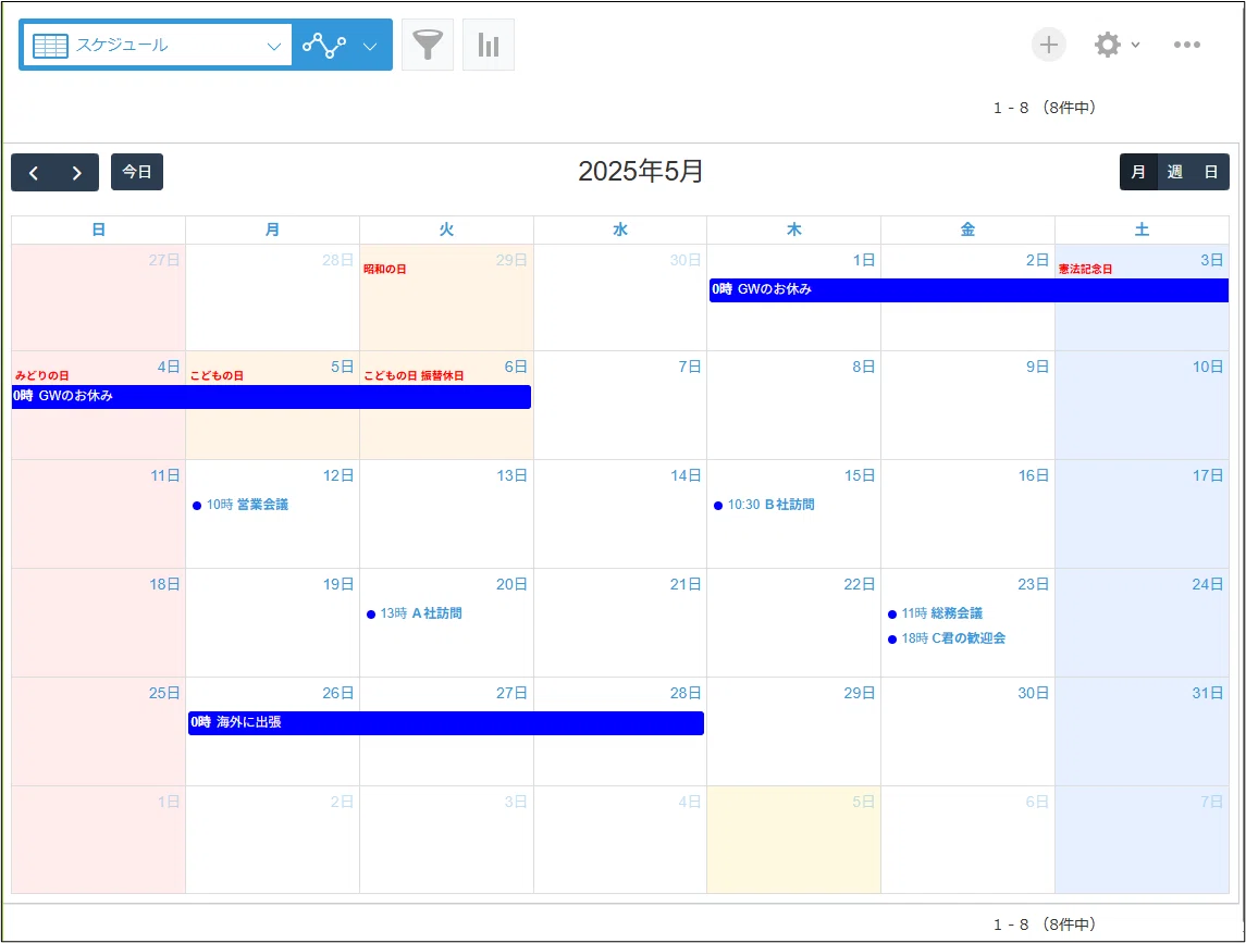 - カレンダービューを月・週・日で表示切替が出来ます。