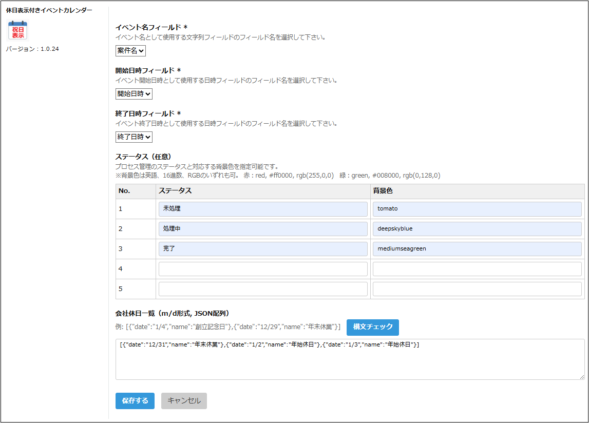 会社独自の休日設定は、json形式で設定します。「構文チェック」ボタンで構文チェックが可能です