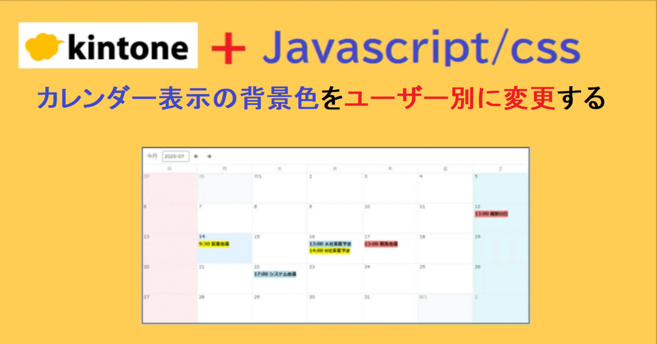 USER_FIELD_CODEに登録ユーザーのフィールドコードを指定USER_COLOR_MAPでユーザーコードと色をマッピングapp.record.index.showイベントでカレンダー描画時に色を適用