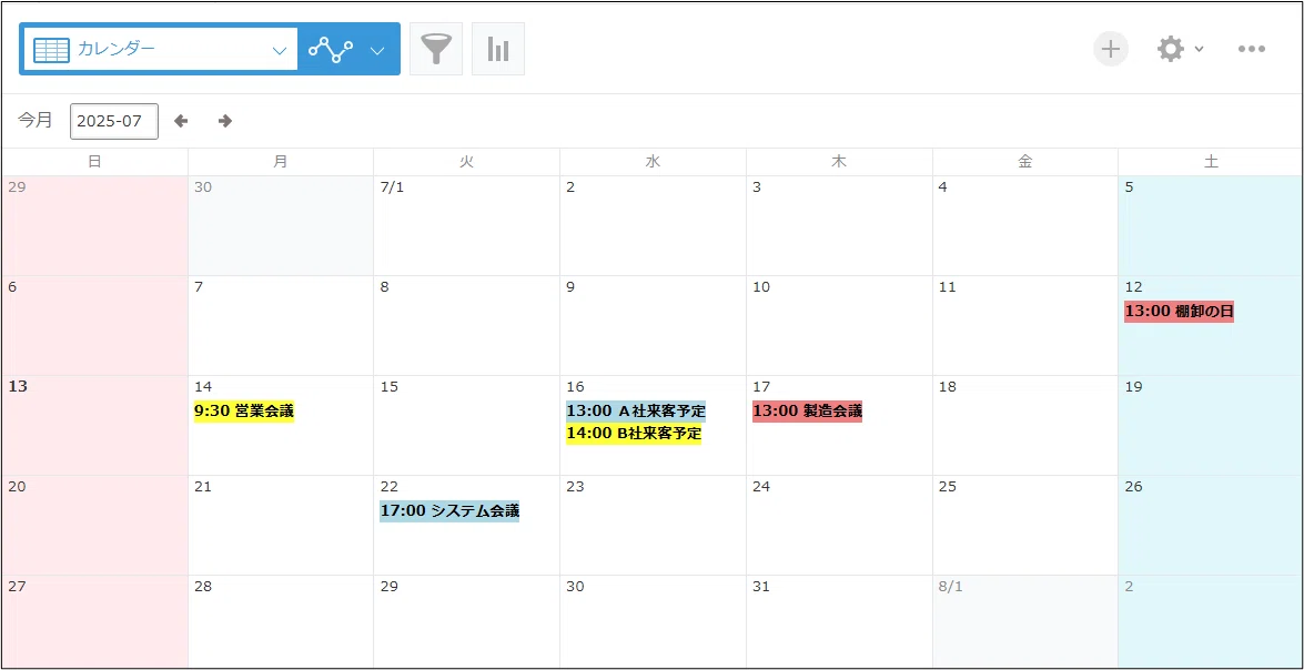 チームごとの予定把握や設備予約など、視認性向上の効果で“うっかりミス”を解消できるカスタマイズです。