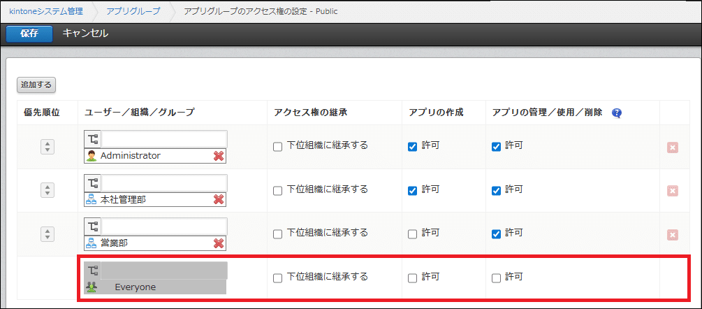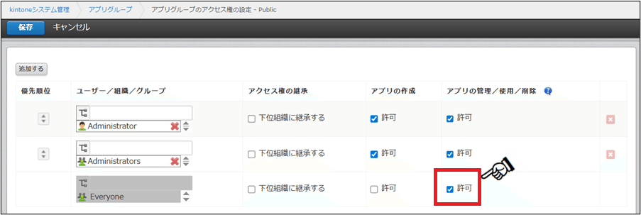 - Everyoneグループに「アプリの管理/使用/削除」の権限をチェック
