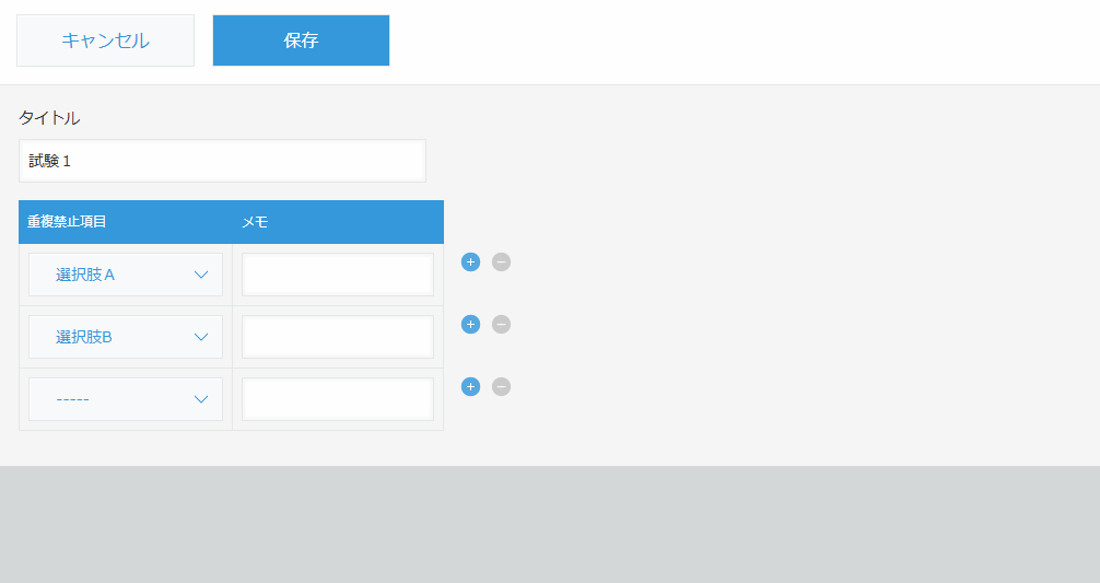 以下のデモ画面では、サブテーブル内の3行目の入力で、既に入力済の「選択肢A」と「選択肢B」を入力すると、画面中央に警告メッセージを表示します。