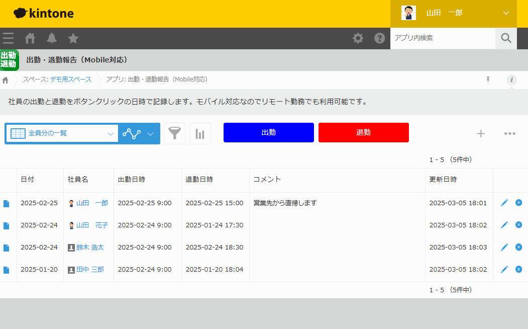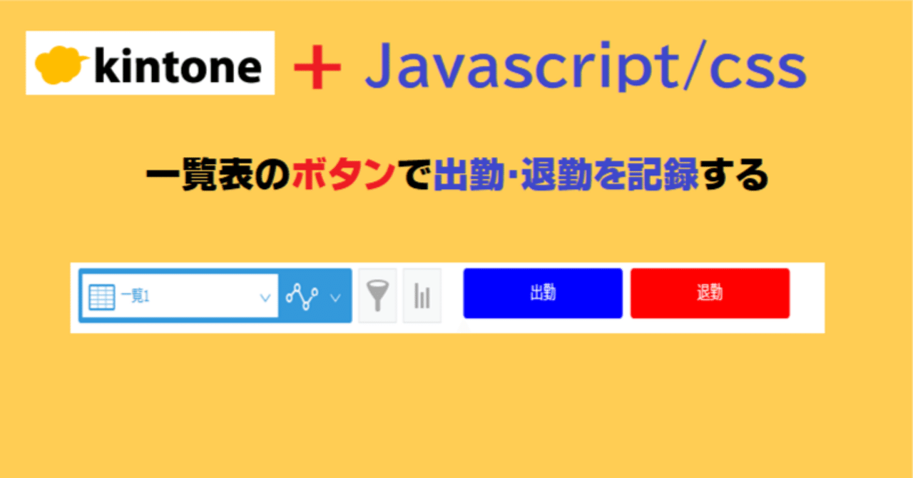 kintoneアプリのレコード一覧表のヘッダーに「出勤」と「退勤」ボタンを設置して、ボタンクリックの「日時」で出勤日時と退勤日時を記録できるようにしました。