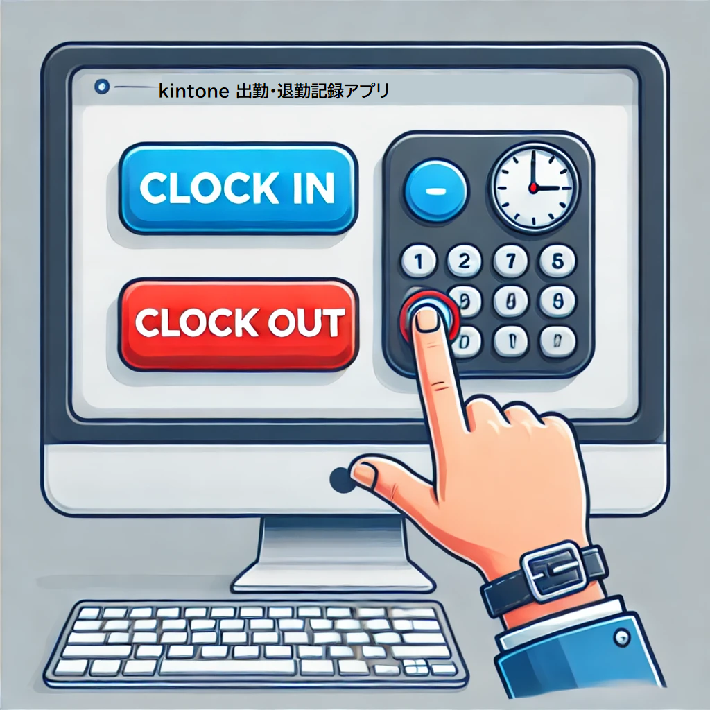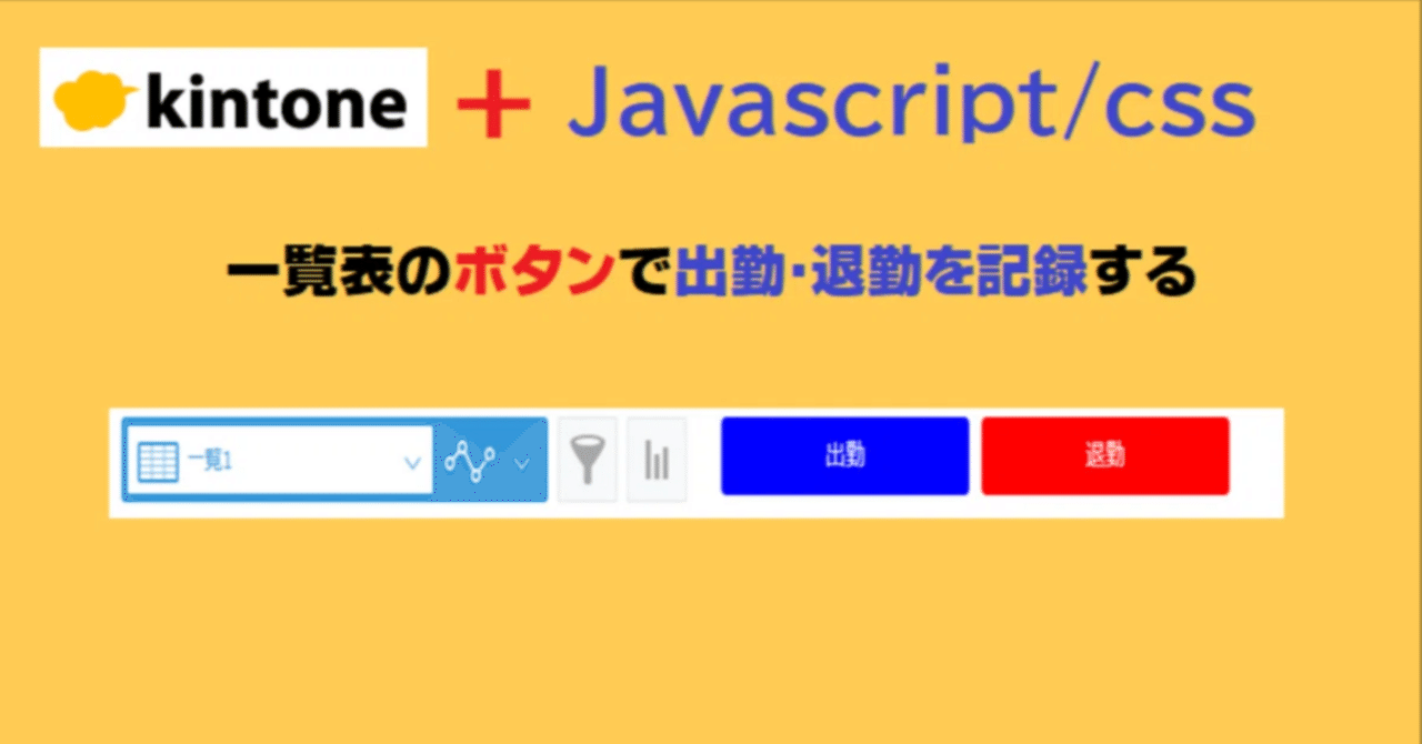 kintoneアプリのレコード一覧表のヘッダーに「出勤」と「退勤」ボタンを設置して、ボタンクリックの「日時」で出勤日時と退勤日時を記録できるようにしました。