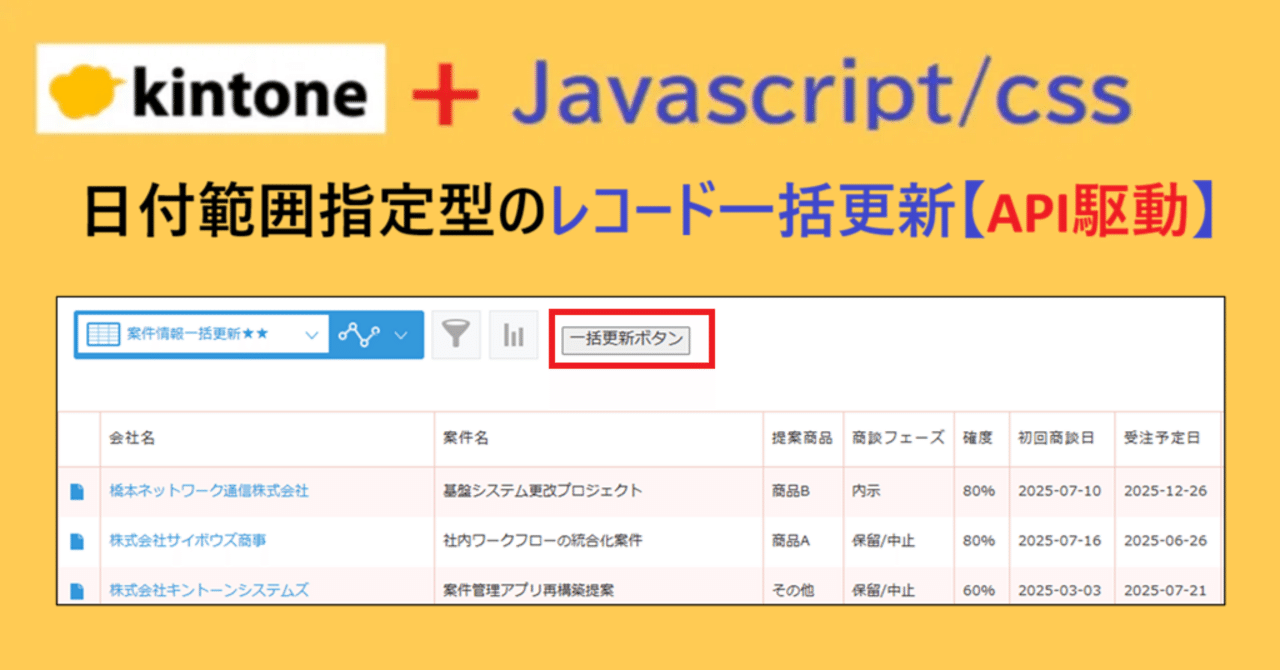 やりたいこと 日付の範囲指定でレコードの一括更新を実行したい! CSVファイルの入出力操作が不要で、画面上のボタン操作だけでAPIで駆動するレコード一括更新機能が欲しい! kintoneアプリの運用で避けて通れないのが「レコードの一括更新」です。 特に、特定の日付範囲のレコードに対するステータス更新やフラグ変更は、頻繁に発生するニーズでありながら、標準機能だけでは意外と手間がかかるものです。 kintone標準機能である日付範囲の複数のレコードを一括更新したい場合は、標準機能...