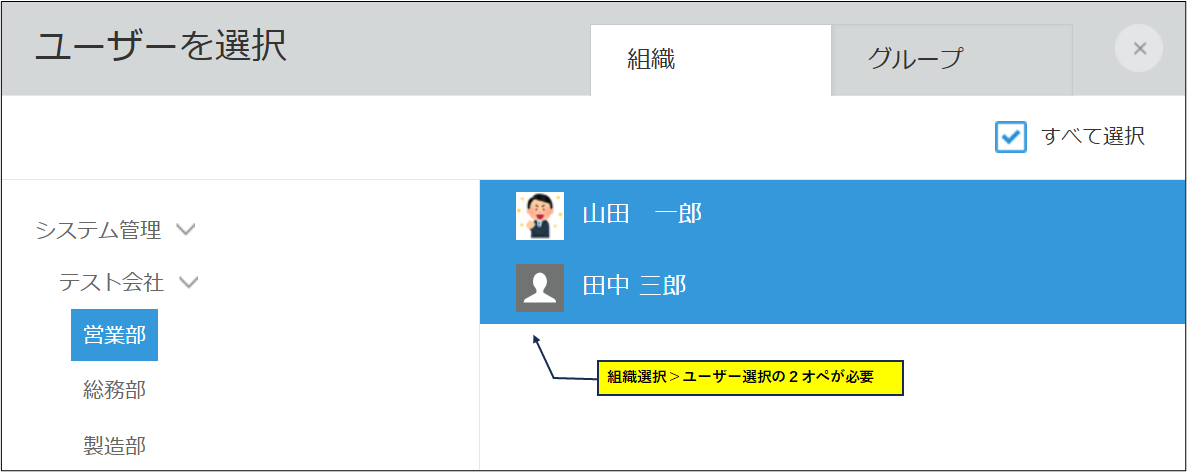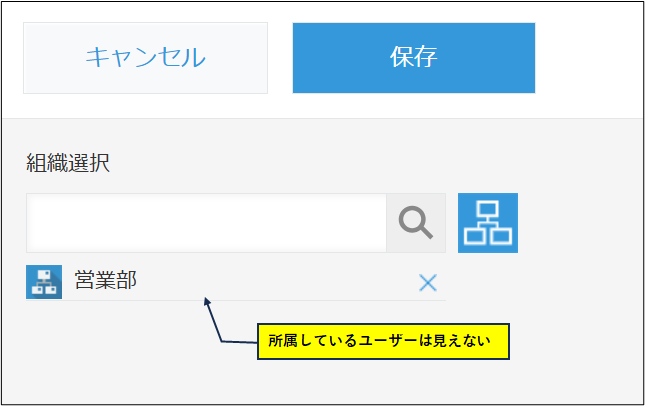 組織を選ぶだけで、その組織に誰が所属しているか一目でわかりますので、システム上の組織に所属しているユーザーを可視化できます。