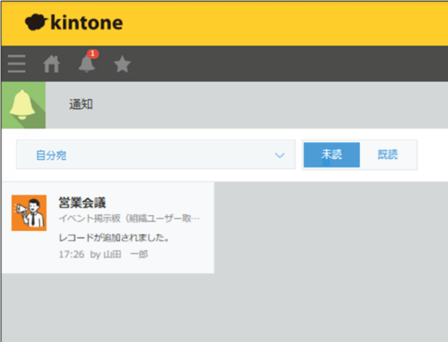 kintoneの自分宛通知は、🔔マークに未読数の通知が点灯します。自分をメンションしている通知に確実に気づくことが出来るので、大切なお知らせを見逃すリスクを軽減できます。