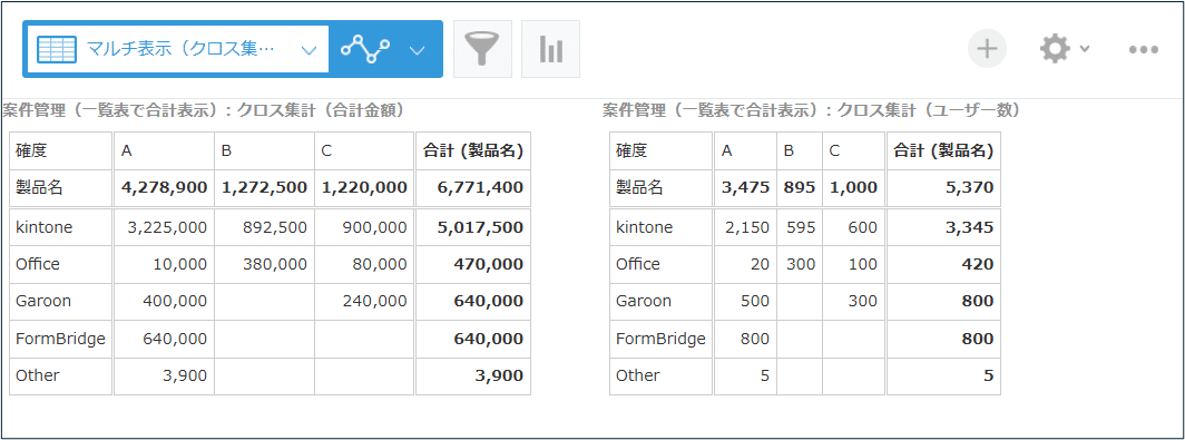 「月別案件数」「売上見込みの集計」「担当者別進捗」「案件別の内訳」を同時に表示できるので、営業会議の資料準備と印刷作業が不要になりました。 - クロス集計表を2種類並べて表示