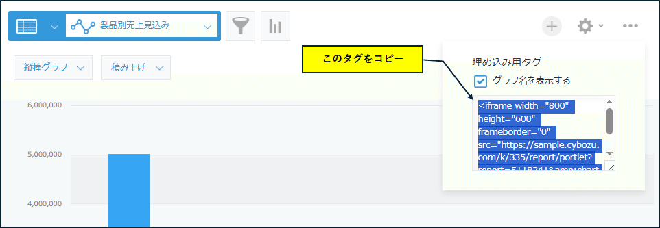 グラフ画面から「埋め込みタグ」をコピーして、カスタマイズビューに貼り付けるだけで簡単に設定できます。