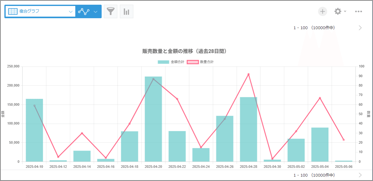 ✨この記事で分かること 今回はkintoneで2種類の複合グラフを作るカスタマイズ事例の説明です。 kintoneの標準のグラフ機能では、2種類のグラフを表示する「複合グラフ」の機能はありません。 「金額は棒グラフで、数量は折れ線で重ねて表示したい!」と思ったことありませんか?そんな要望にお応えするのが今回のカスタマイズです! ✨どんなグラフが作れるの? 今回のカスタマイズで実現できるのはこんなグラフです👇 複合グラフ X軸(日付)に沿って、販売実績を表示 Y軸(左):合計金...