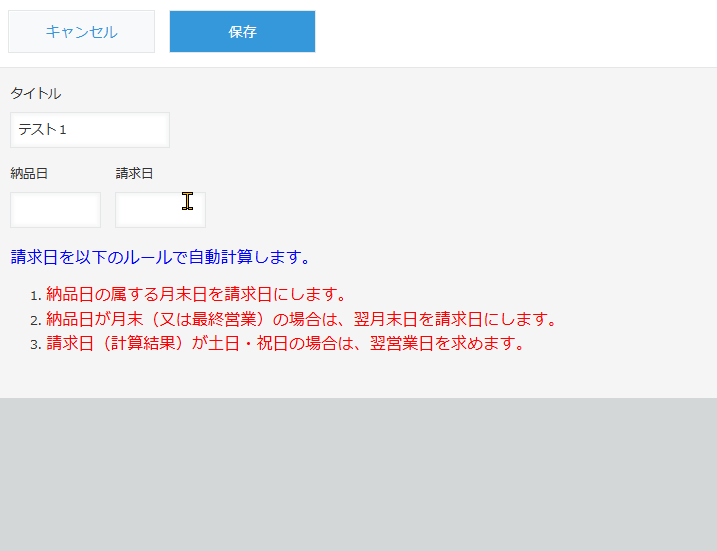 以下の日付と計算ルールで、請求日を計算しているデモ画面を示します。